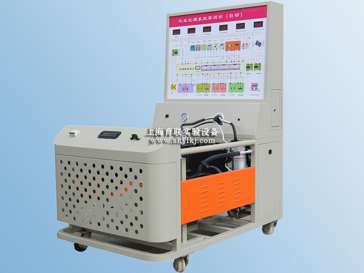 自动空调制冷系统。采用优质钢板骨架,经过机械加工成型,外表面喷涂彩色环氧聚塑。空调实验台后边设置对开门,方便维修。右侧边故障设置装置。底部采用带刹车的万向轮,移动和固定两相宜方便调整设备的摆放。
