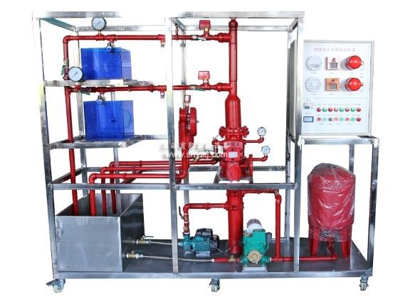 本系统全部元器件均采用标准工程件,整个实训装置主要由报警阀、蝶阀、排气阀、水流、指示器、洒水喷头、水箱、高位水箱、主泵、辅泵、控制电器、管路系统等组成。