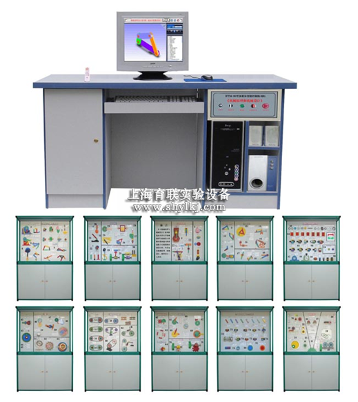陈列柜共分十个柜和一个电脑控制台,进行多媒体声控同步解说演示。由PC机电脑控制顺序或任选运行每个柜模型动作,同时电脑播放图形同步模型动作。并且每个柜的内容在电脑里用PPT格式编写,内容包含机械原理、机械设计、课程设计等教程数据,采用Microsoft PowerPoint 演示文稿进行幻灯片放映,方便学员课外进行学习和研究。本陈列柜上下柜整体采用彩色塑钢结构,坚固耐用,外形美观。