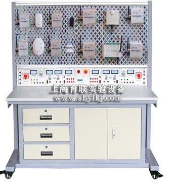 智能楼宇虚拟传感器实验平台由实训工作台面(内置5V/3A、12V/3A、24V/2A 直流电源,4路交流220V电源)、实训桌、储物柜三大部分组成,要求以成型方钢作为设备主要框架材料;实训工作台面、地盘采用焊接连接、关键部位采用三角筋用内六角螺钉加固连接,表面需经高温喷塑处理,能有效起到防锈绝缘;实训工作平台由铝合金型材及滑槽组成网孔板;网孔板的下方配备双工位电源箱,电源箱带电源保护装置、电源指示装置及电源输出;实验桌底部装有至少4个导向轮,方便设备移动;设备需配备储物柜,用于存放工具以及实训器件;设备储物柜