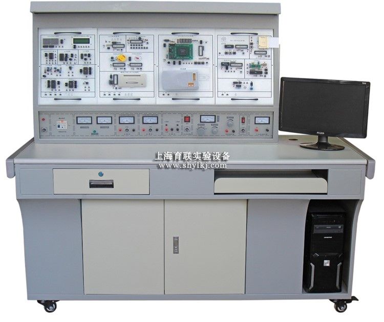 (二)实验桌:实训桌为铁质亚光密纹喷塑结构,桌面为防火、防水、耐磨高密度板;上部左右设有两个大抽屉(带锁),用于放置工具及资料,下部设有全封闭元件储藏柜,电脑桌联体设计,造型美观大方。