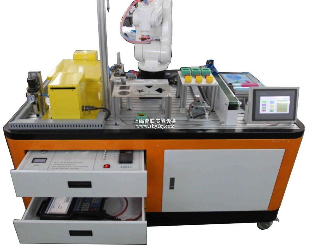 工业机器人码垛教学实训平台以小型的柔性制造系统为载体,主要特点是占地空间小,是由一台工业6轴自由度机器人、PLC触摸屏编程模、码垛平台组成,实现自动化码垛无人工作站,机器人按指令码垛;该系统能够实现工业机器人码垛工作站系统的编程、码垛系统的集成、PLC系统编程、通讯实训、机器人编程、等环节。让学生轻松掌握工业6轴机器人码垛系统,能满足学生对工业机器人学习及操作的需要,实现和工厂实际情况无缝对接,涉及的知识点丰富、综合,系统性强,学生通过该套系统的学习与训练,对智能无人工的组建整体性应用有全面的了解与体验。
